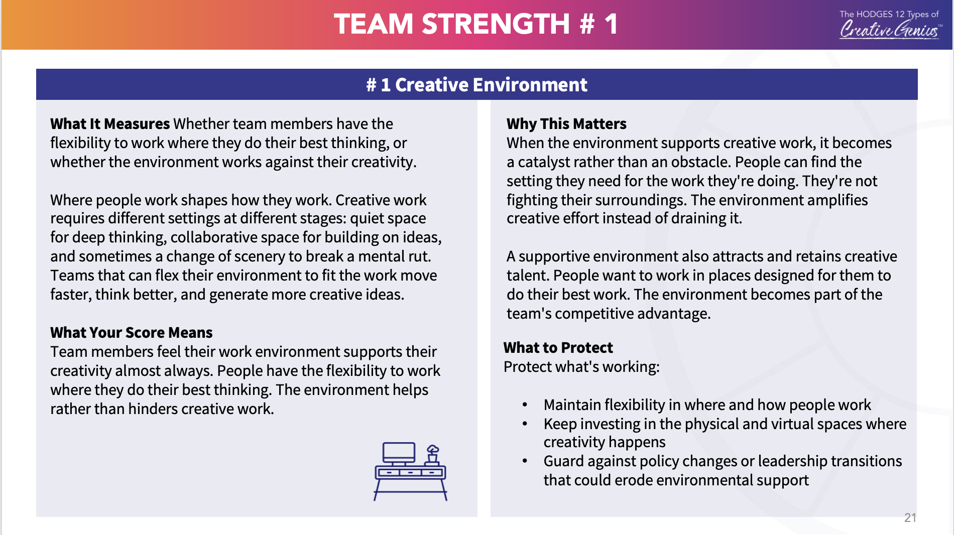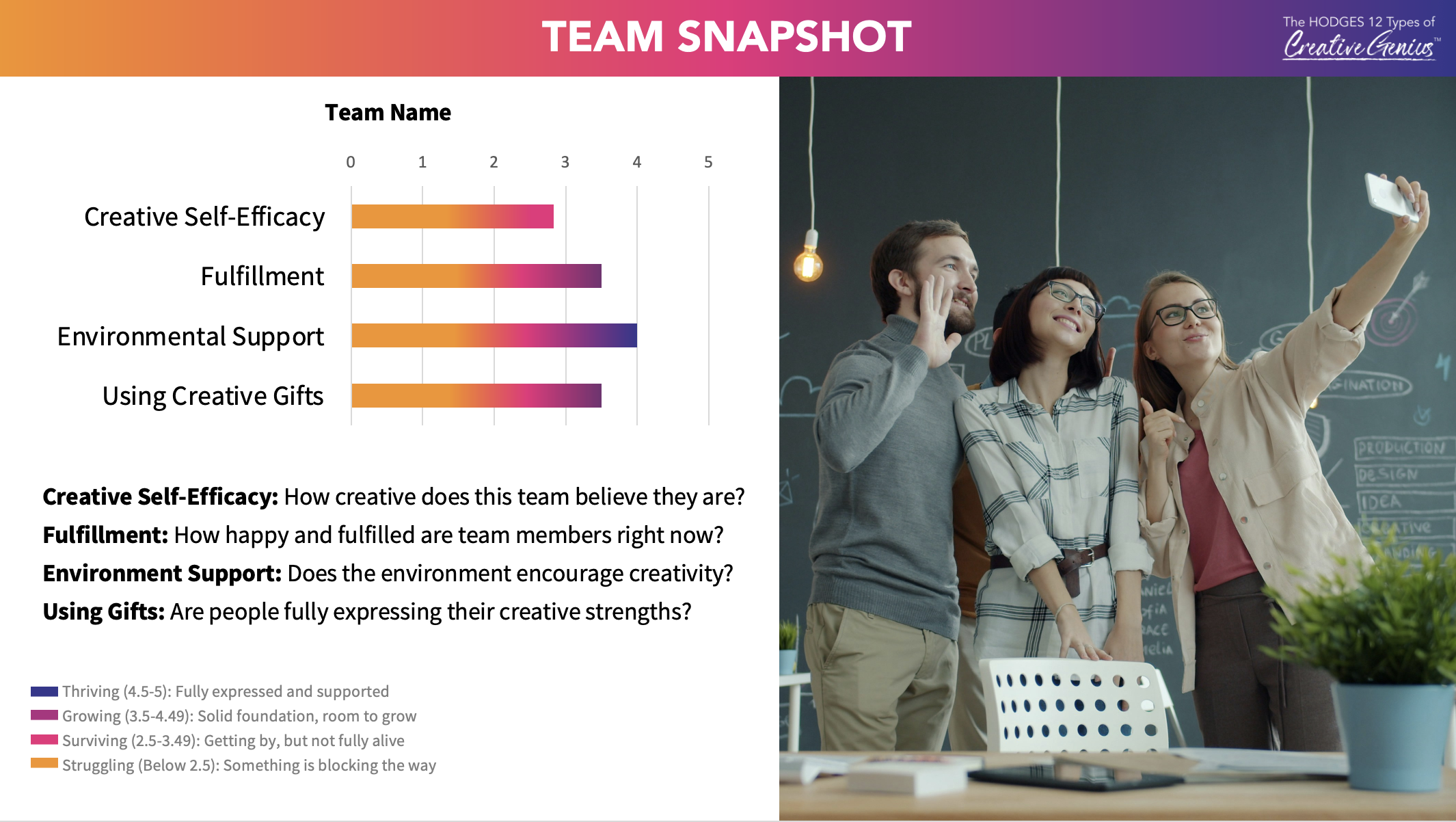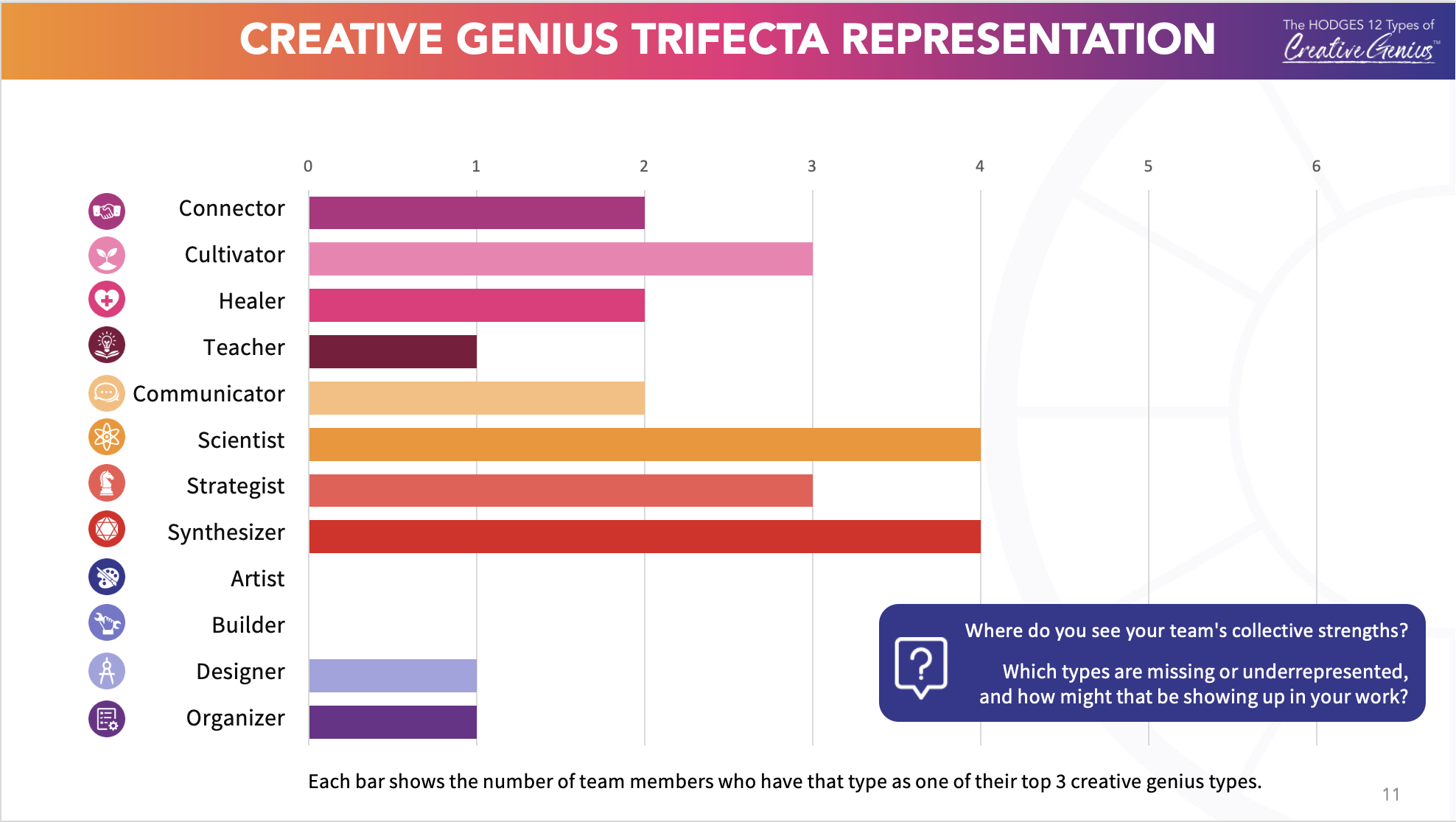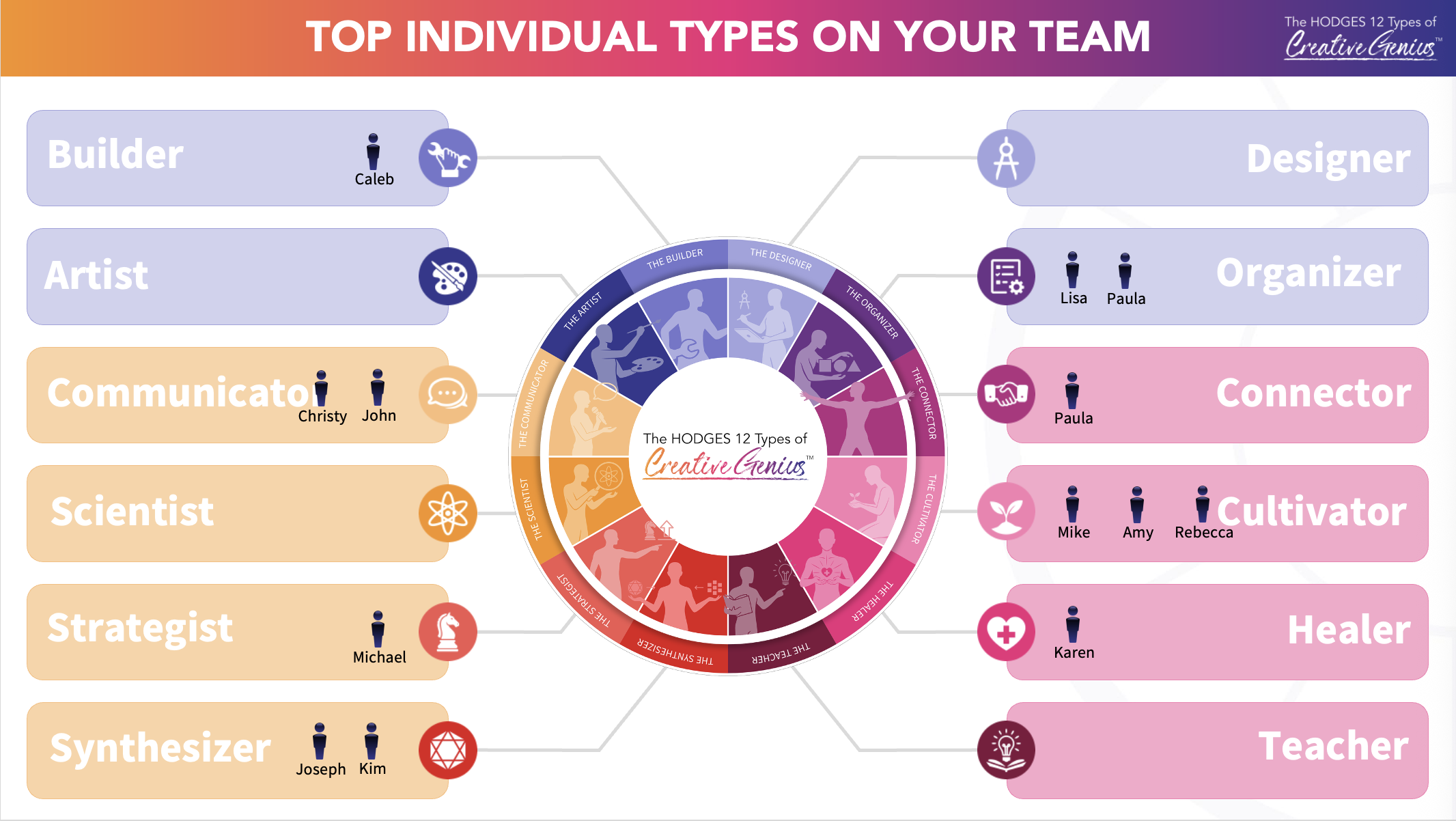 The Hodges 12 Types of Creative Genius™ Team Assessment for every participant (includes individual Creative Genius Trifecta profiles)