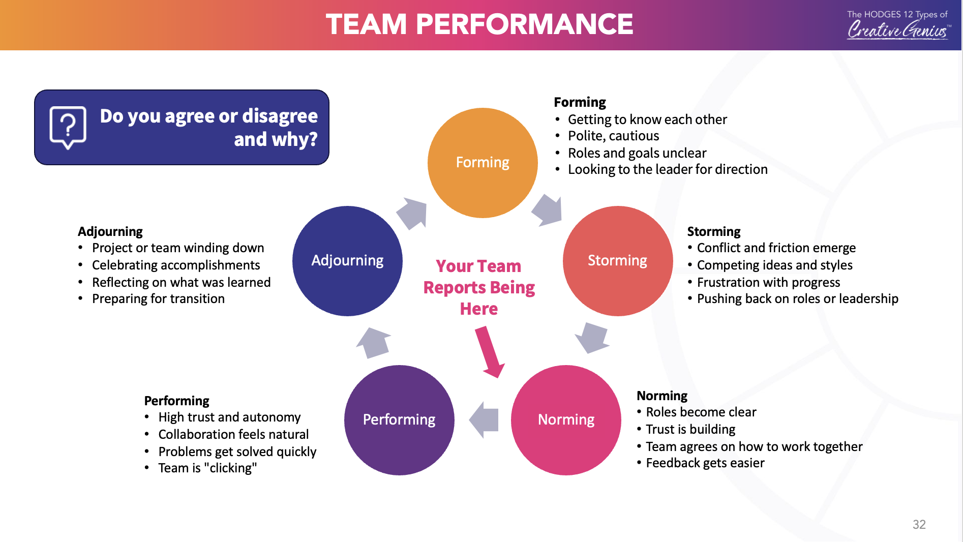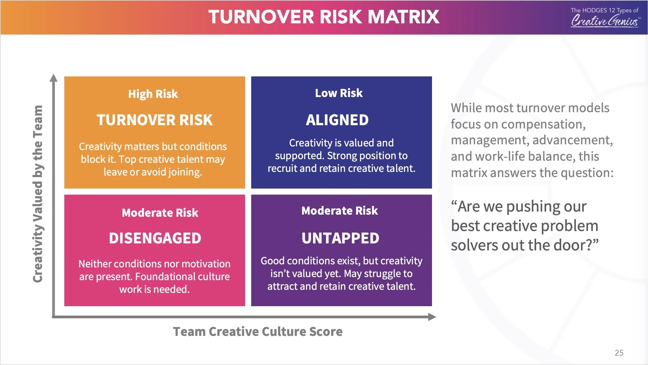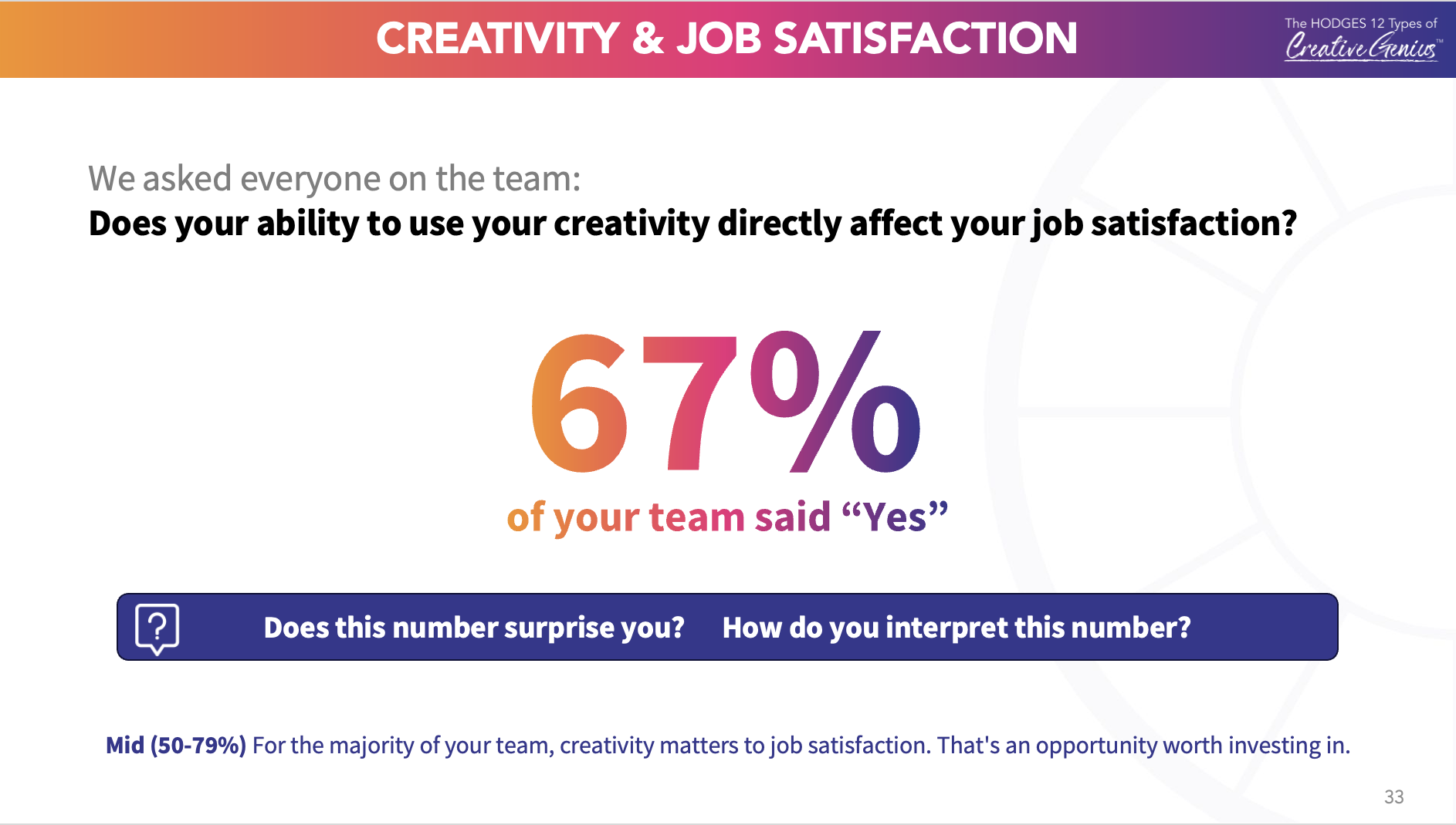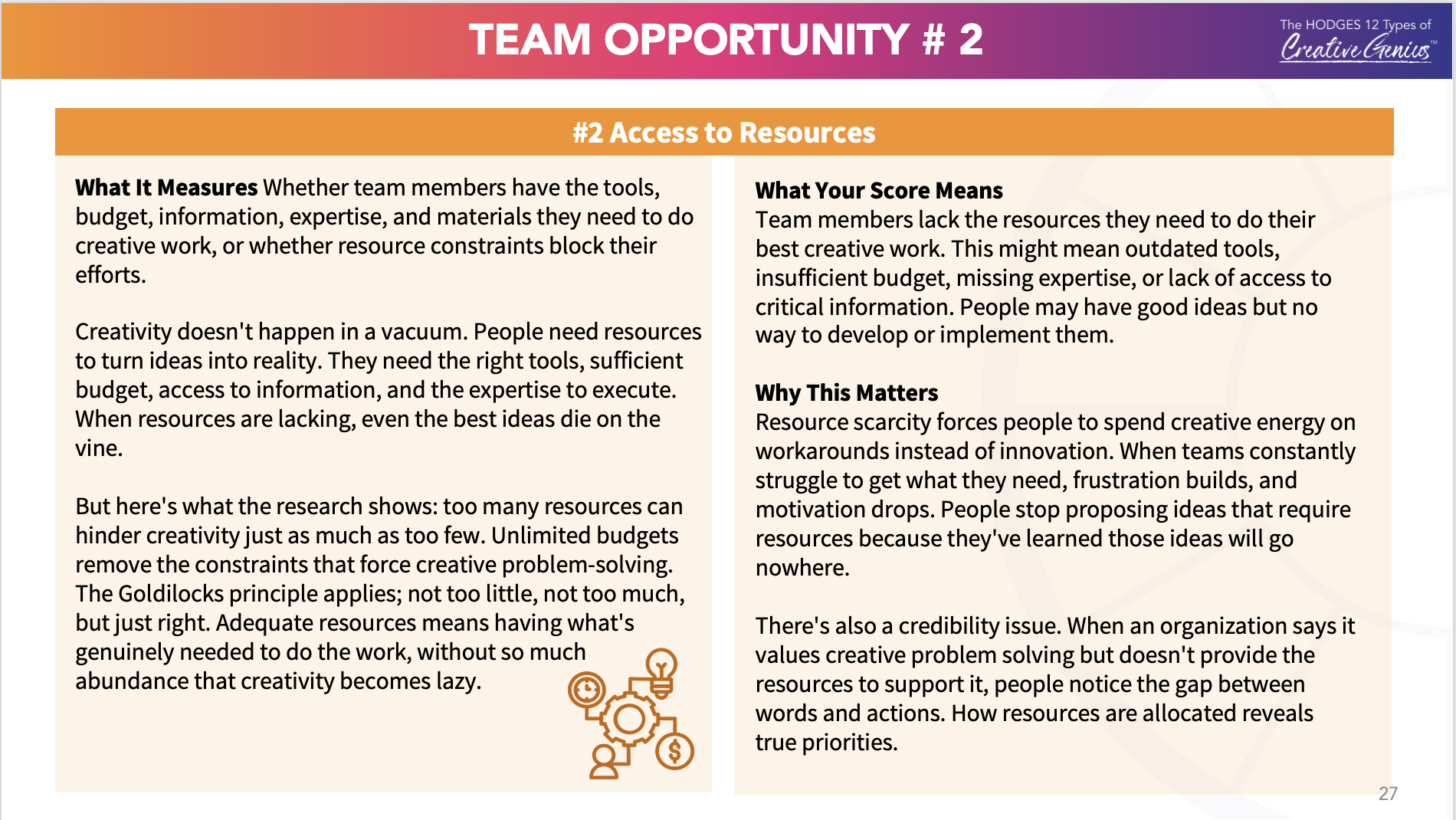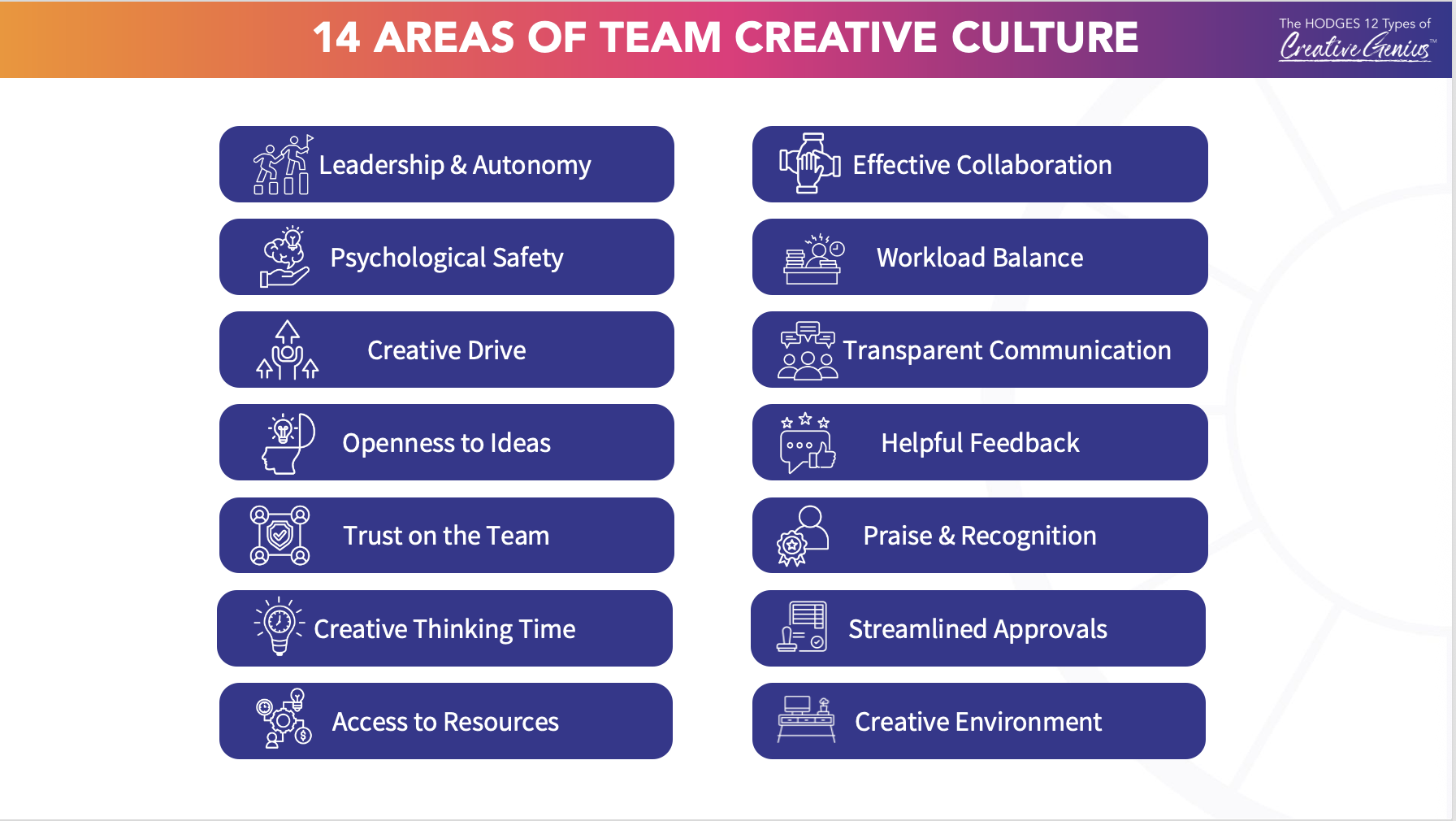 The Hodges 12 Types of Creative Genius™ Team Assessment for every participant (includes individual Creative Genius Trifecta profiles)