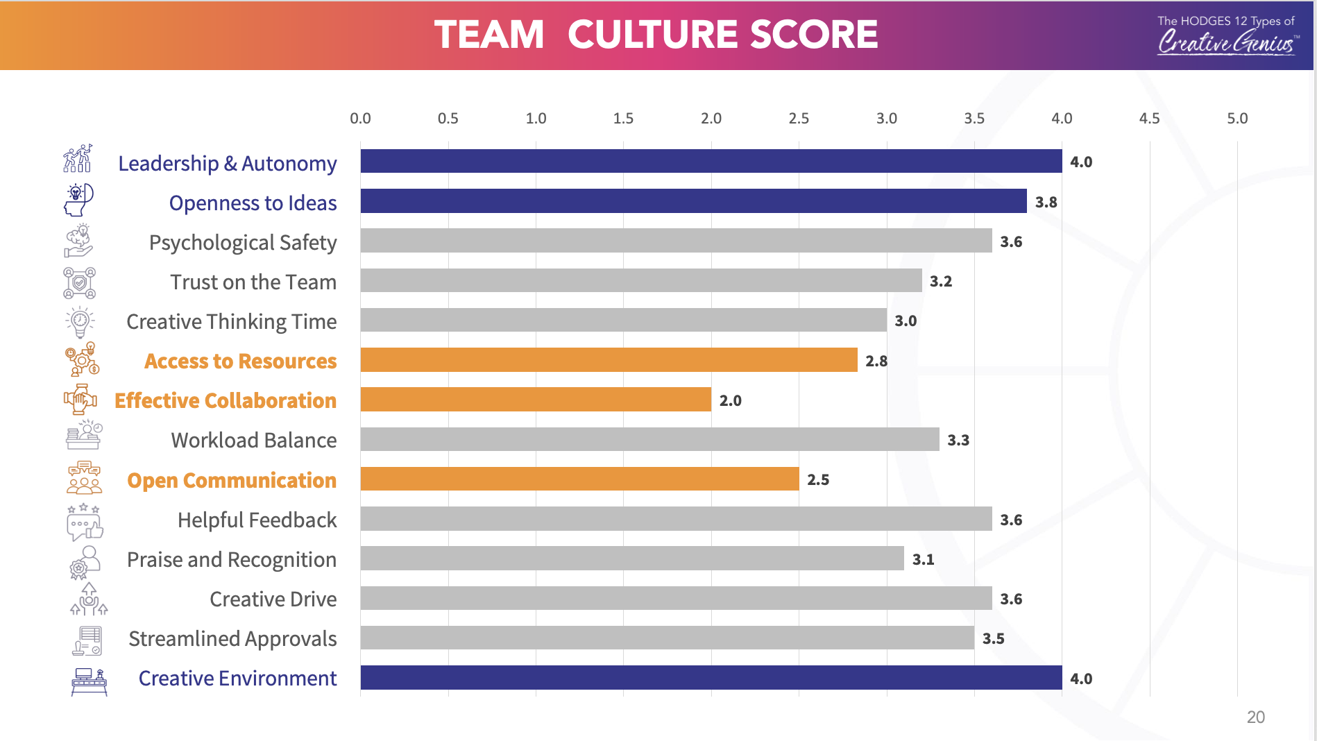 Everyone on your team will take The Hodges 12 Team Innovation Index™ which includes their individual profile and the team profile which we will explore and activate together.